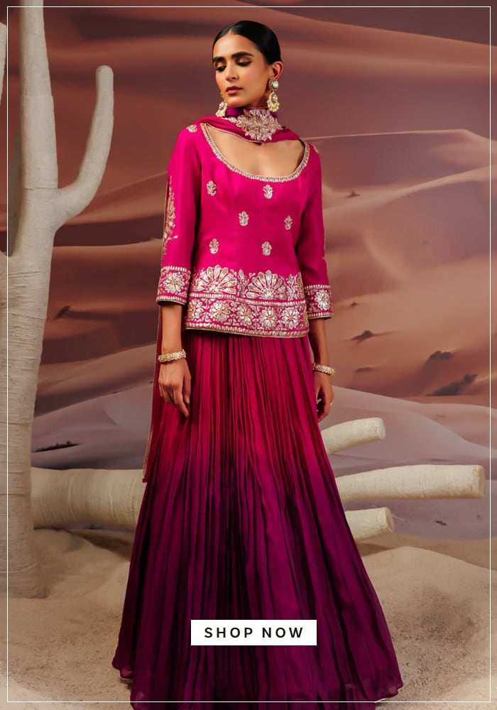 If you want to wear something slightly more glamorous, a designer lehenga works beautifully. While lehengas are often associated with weddings, a lightweight, vibrantly colored lehenga choli fits right into a spring celebration. Look for designs featuring mirror work, gota patti detailing, or vibrant block prints. Pair it with statement jewellery like large jhumkas and a maang tikka to complete your elegant traditional wear outfit.