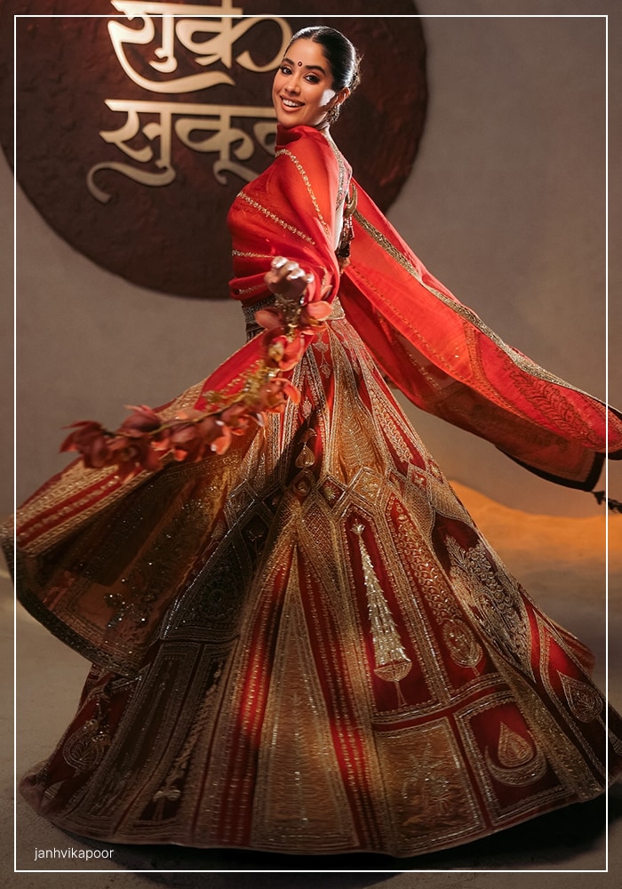 Janhvi turned into the ultimate modern bride in the “Tenu Takdi Ravah” lehenga from Masaba Gupta’s bridal collection. This deep crimson masterpiece featured a rich interplay of red shades and tissue patchwork, adorned with shimmery hand-embroidered motifs inspired by nature, paired with a butterfly-hem blouse woven with gold thread. The look was completed with a matching red veil featuring Masaba’s signature “Pankh Bagh” motifs and styled with chunky floral studs and flower-themed kaleeras, setting the perfect template for the upcoming wedding season.