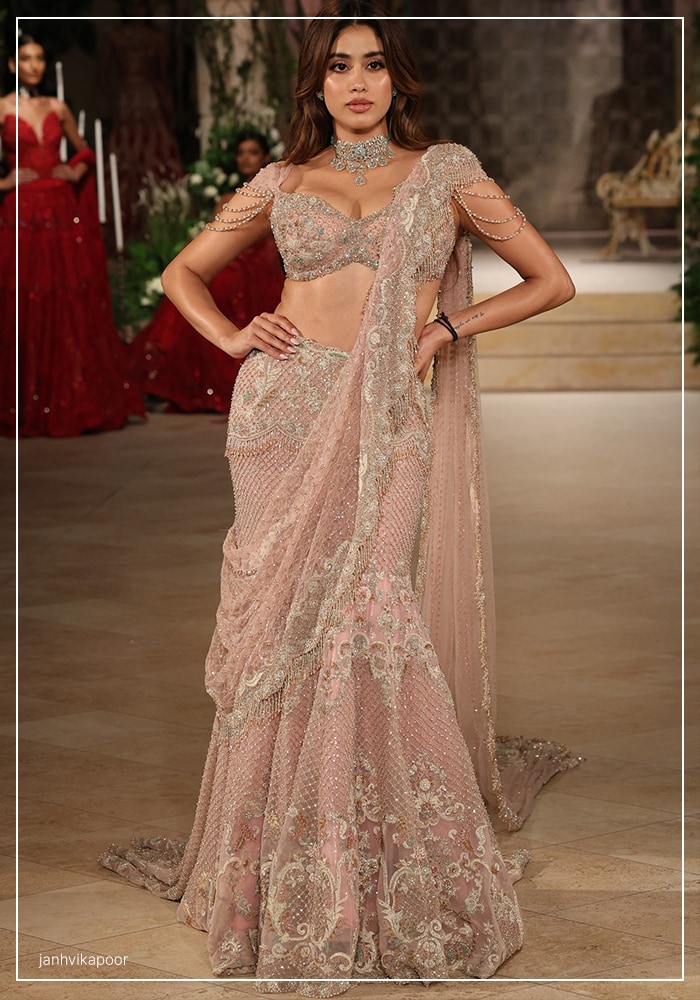 Closing our list is the breathtaking pastel pink lehenga saree by Jayanti Reddy, showcased at the Hyundai India Couture Week 2025. This modern reimagining of the saree featured a fish-cut silhouette on a delicate net base with heavy zardozi embroidery, but the sculpted bustier blouse stole the show with its plunging neckline and cascading pearl chain sleeves. A soft net dupatta trailed behind her as she walked, and she styled the outfit with a statement floral choker by Kishandas & Co., perfectly blending contemporary glamour with traditional opulence.