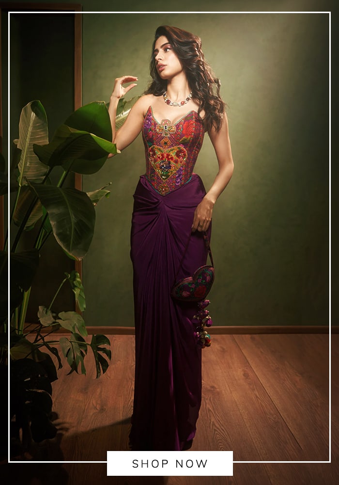 The structured corset created a striking silhouette, while the rich detailing reflected Torani’s signature celebration of Indian storytelling through textiles. Paired with the corset was a flowing, floor-length draped skirt crafted from silk crepe.