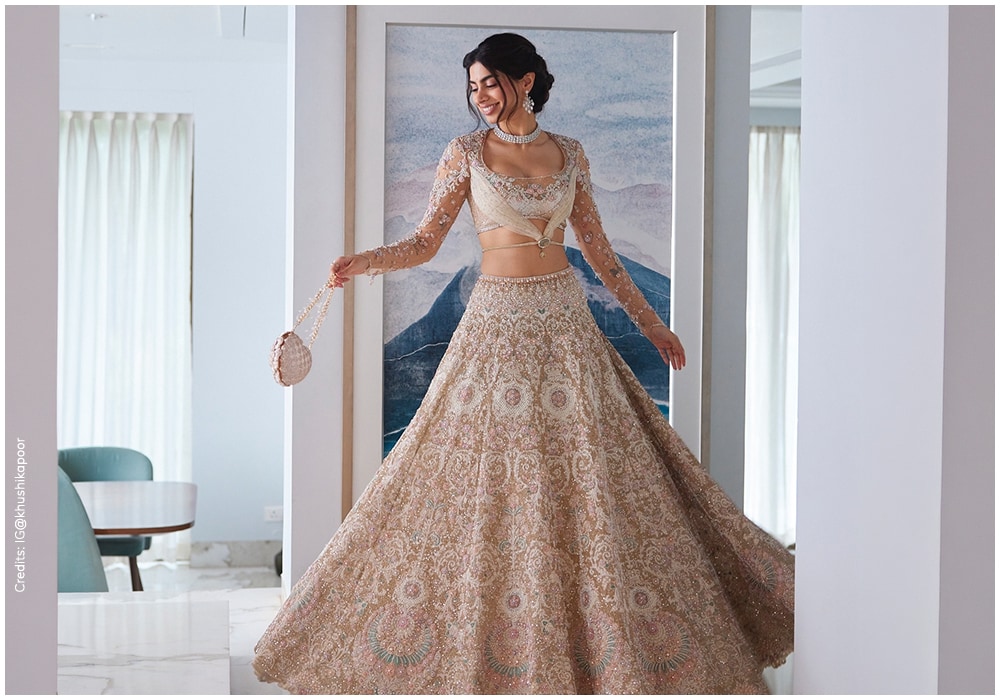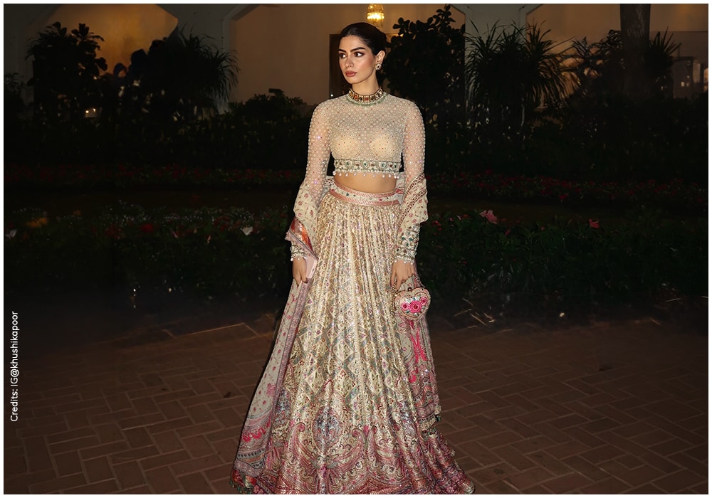 Khushi Kapoor delivered another memorable fashion moment in an ivory Tarun Tahiliani lehenga while attending a friend’s wedding. Styled by Mohit Rai, the outfit reflected the designer’s signature approach to blending heritage techniques with contemporary elegance.
